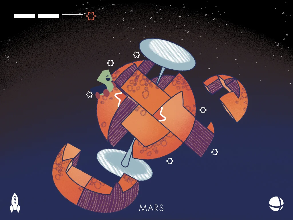 Players use characters based on NASA rotors to solve spherical planet puzzles and reach their cores.